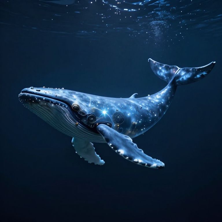 A detailed digital illustration of a colossal clockwork whale drifting underwater. The whale features a transparent belly filled with glowing stars that pulse rhythmically, blending mechanical elements with a cosmic theme. Deep blue ocean surroundings enhance the mystical and serene atmosphere.