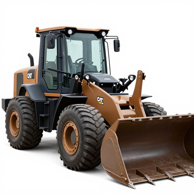 Cat-branded wheel loader positioned prominently, featuring a robust brown frame, large black tires, and a prominent front bucket, showcasing its industrial strength and design.