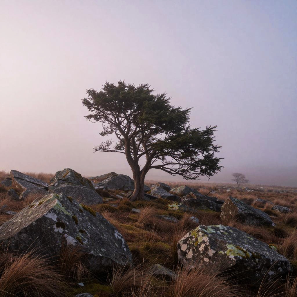 Whispering Pines, rocky desert plateau, blazing midday heat, harsh direct sunlight, Realistic, warm color palette, crisp shadows