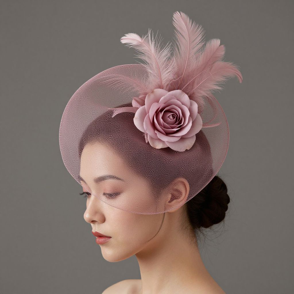 A woman dons a delicate dusty pink feather fascinator adorned with a lifelike rose, exuding elegance in a high-definition digital rendering that captures the soft, ethereal beauty of the ghostly floral accessory against a muted backdrop.
