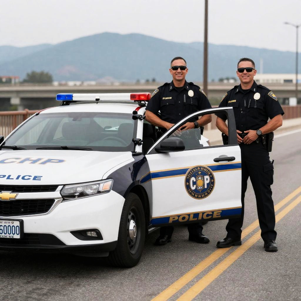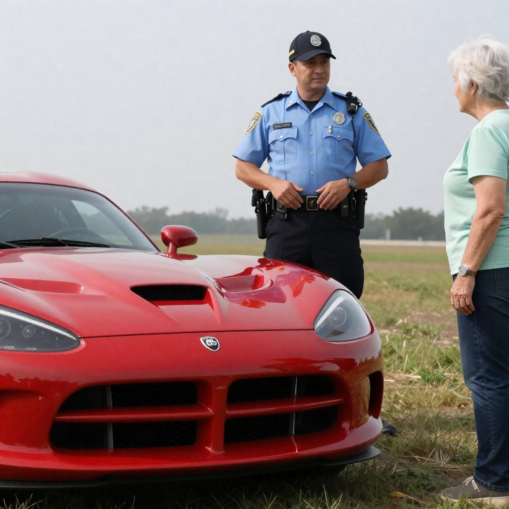 Photograph of three people, two police officers pointing, one with arms raised, beside a red muscle car with a California license plate. Car has front-end damage. Background: rocky hillside, orange traffic cone. Two cars, one partially visible. Sunlit, outdoor setting.