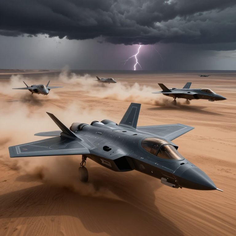 A squadron of stealth futuristic fighter jets patrolling a vast desert wasteland under a stormy sky, metallic dark gray with angular stealth shapes, dust swirling around from powerful jet engines, ominous atmosphere with lightning illuminating the scene, hyper realistic style.