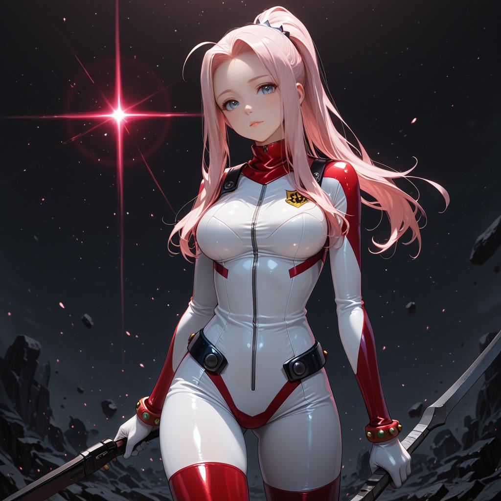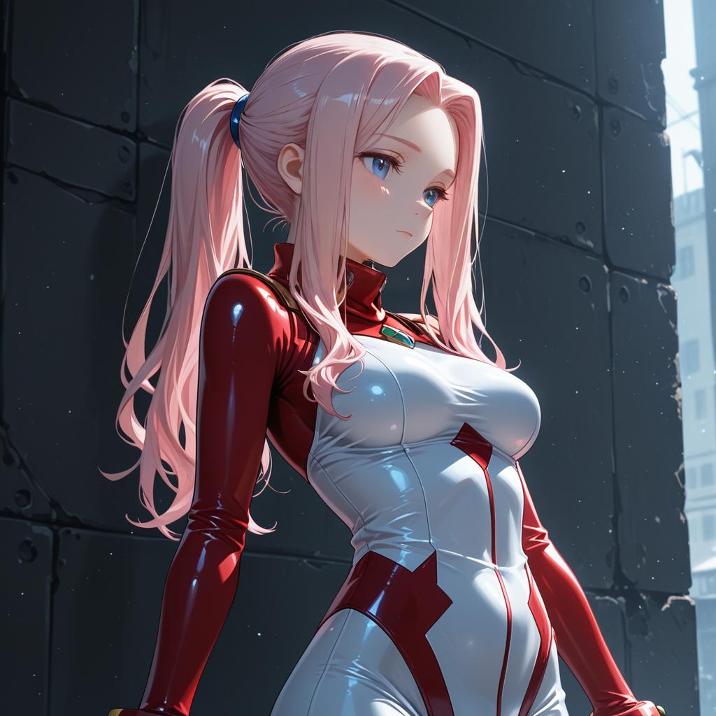 Darry adai, tengen toppa gurren lagann, 1girl, blue eyes, pink hair, long hair, ponytail, white bodysuit, red bodysuit, by artist nagayori, illustrious