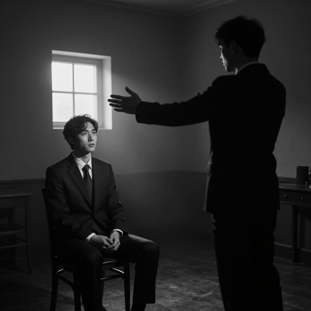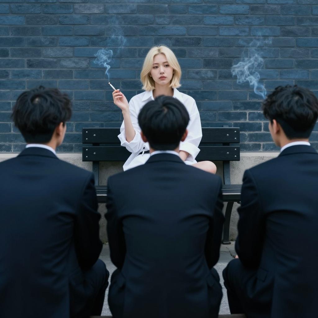 Woman with short blonde hair, wearing white oversized shirt, sitting on black bench, legs crossed, holding cigarette. Three men with dark suits, backs to camera, seated in front. Blue-tinted brick wall background. Smoke from cigarette. Men focused on woman.