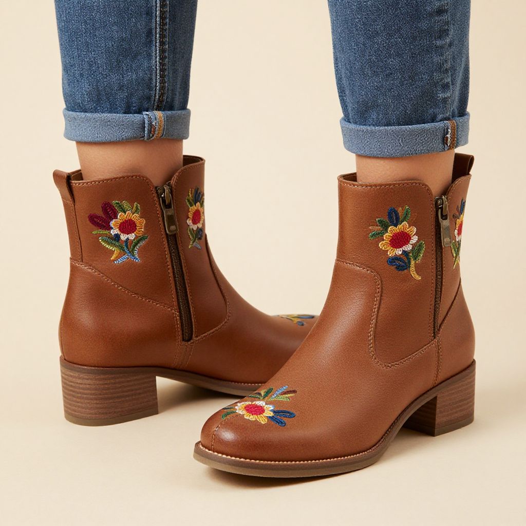 Pair of Hoxekle Woman Fashion Embroidery Ankle Boots featuring side zippers, round toes, and retro floral embroidery, showcasing soft leather construction and outdoor-friendly short design.