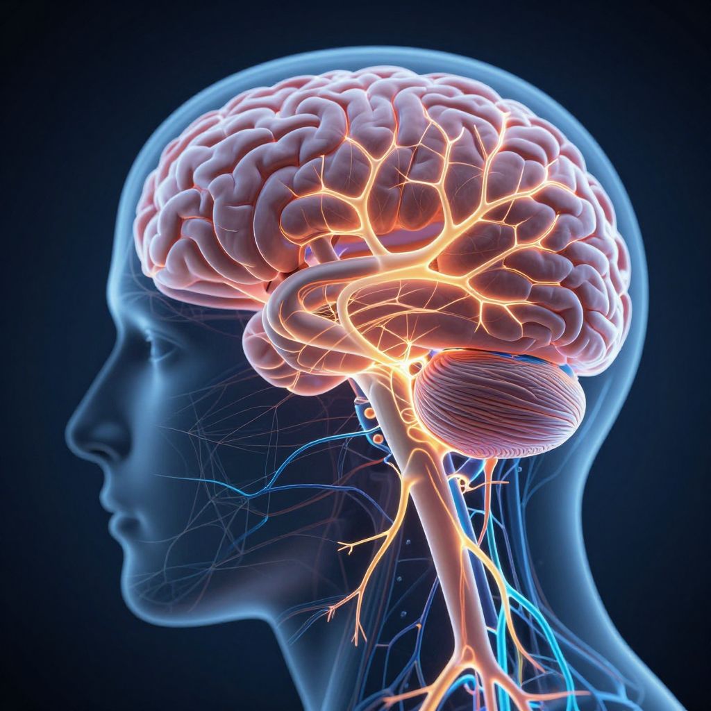 Sistem represented as a bio-organic network within a human body, glowing neural pathways and synapses, vibrant light pulses, blending organic and technological elements, scientific and medical visualization style, futuristic anatomy with high detail and realism, illuminating brain cortex.