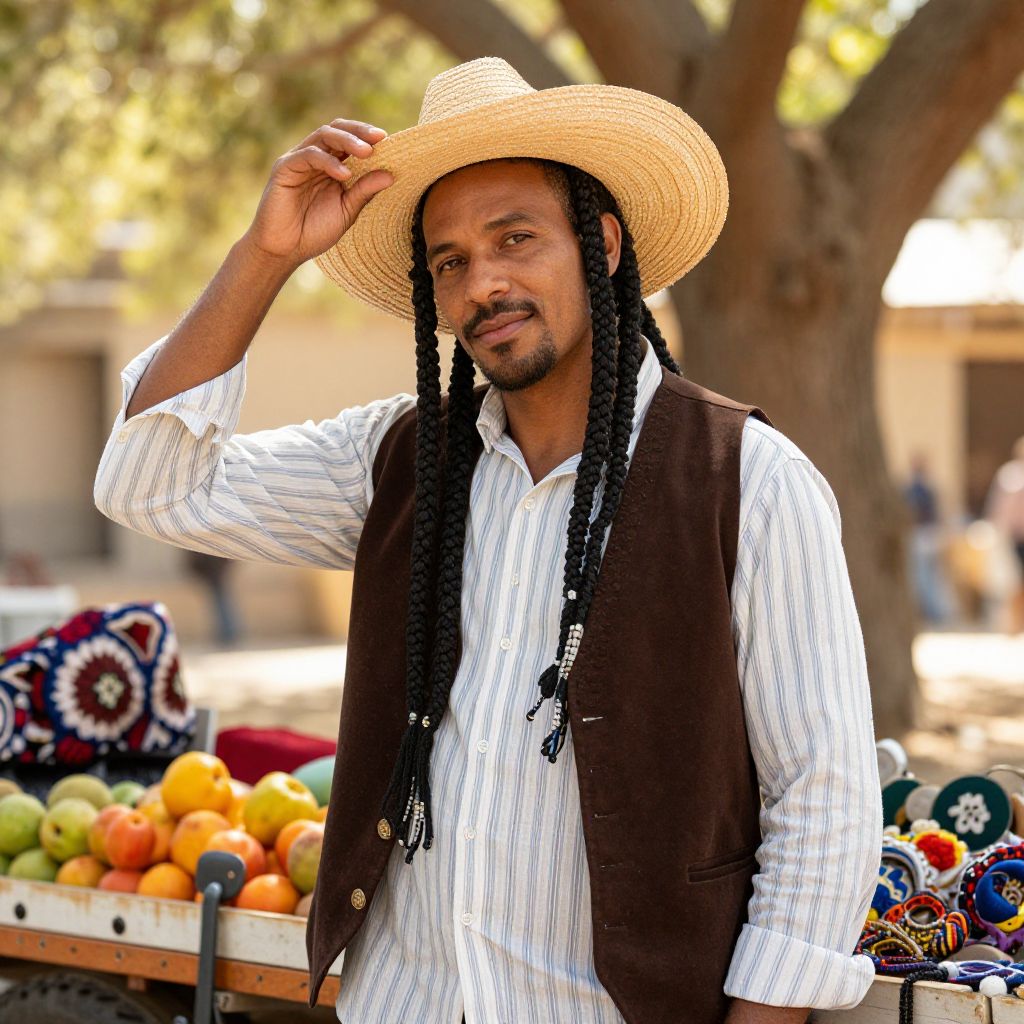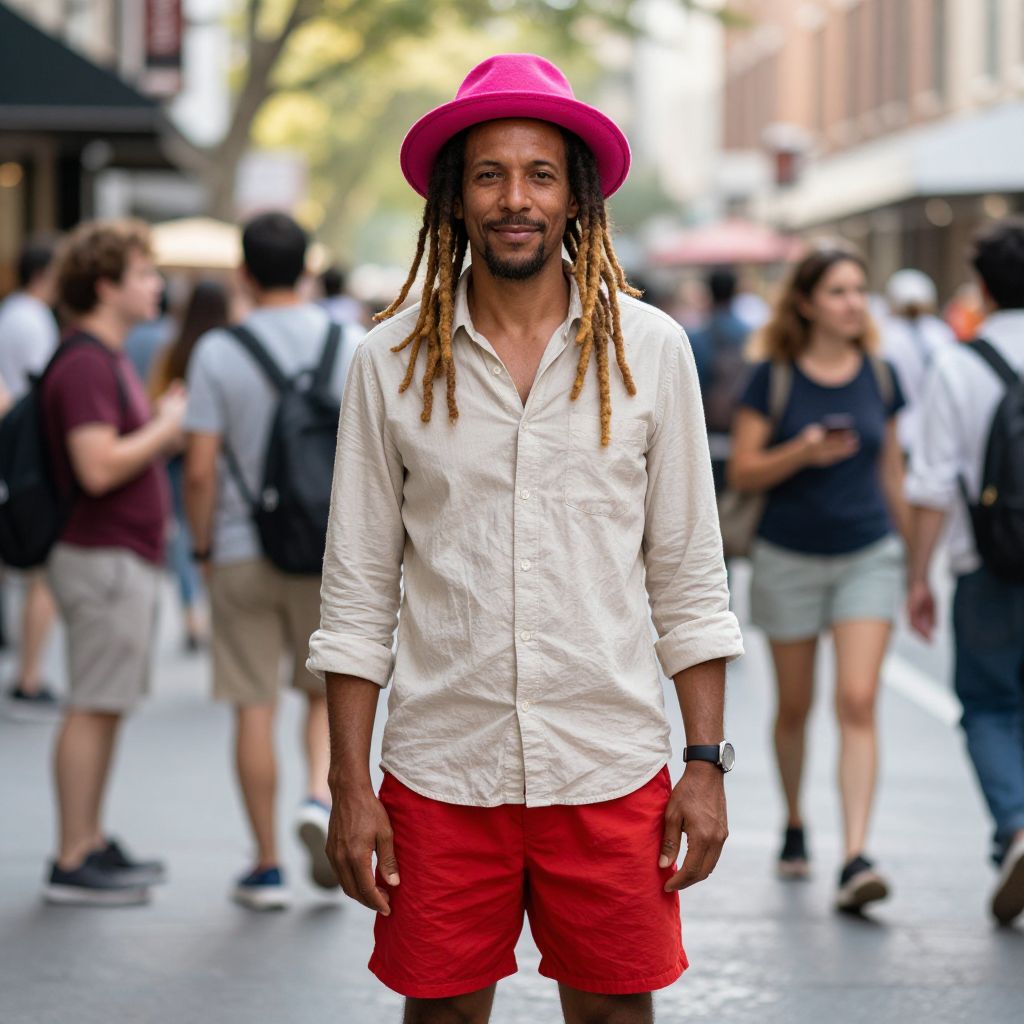 A man with vibrant dreadlocks and a bright pink hat on his head is wearing red shorts and a beige button-up shirt. He stands confidently on a bustling city street, surrounded by a lively background of other people walking, chatting, and going about their day. The scene is sunny with soft sunlight filtering through the street, adding warmth to the atmosphere. The man has a friendly, approachable expression, and his outfit stands out among the crowd, creating a sense of individuality and charm.