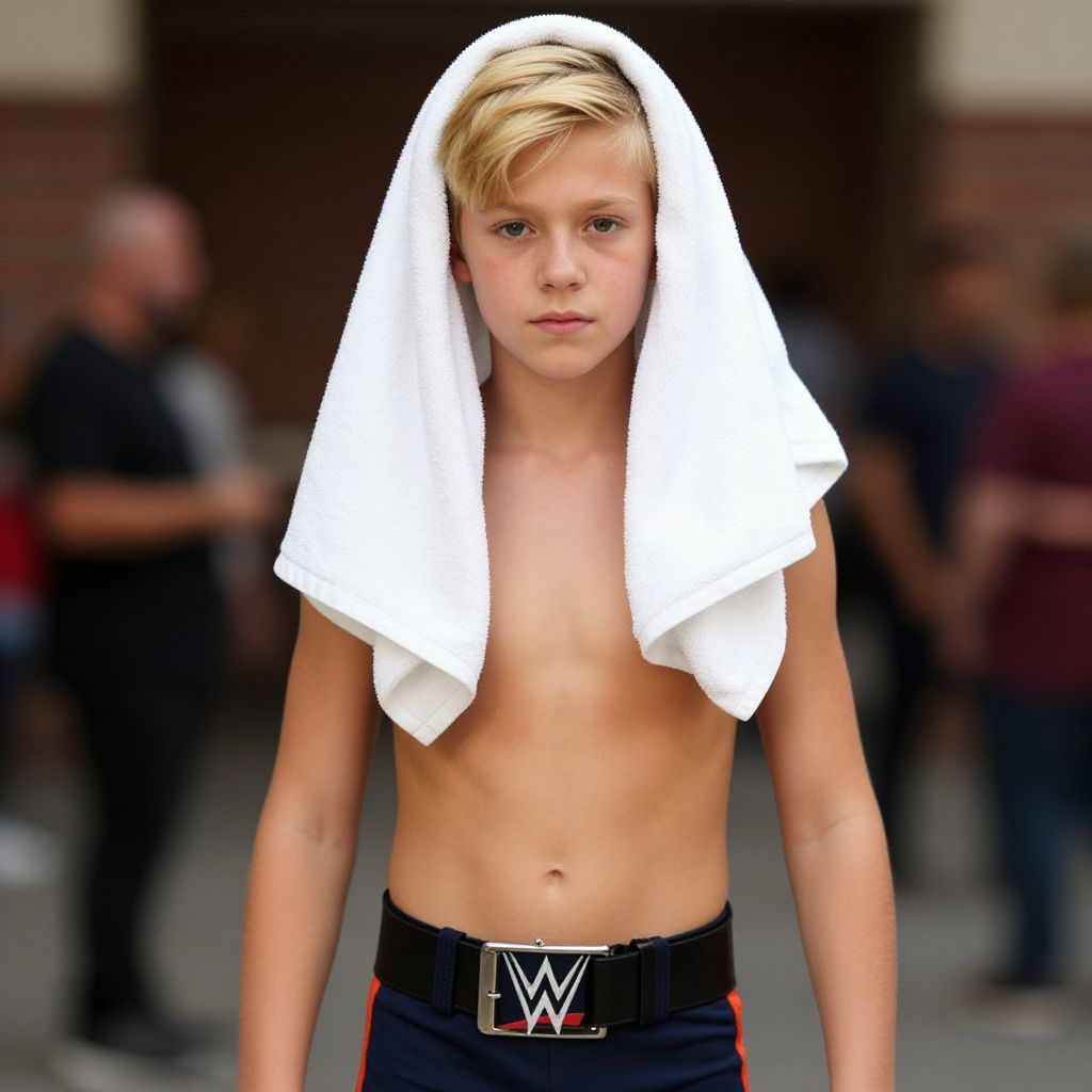 "wwe youth costume, realistic, solo, male focus, 1boy, blonde hair, blurry background, belt, looking at viewer, blurry, towel on head Realistic photo of casual sexy person with pretty face"