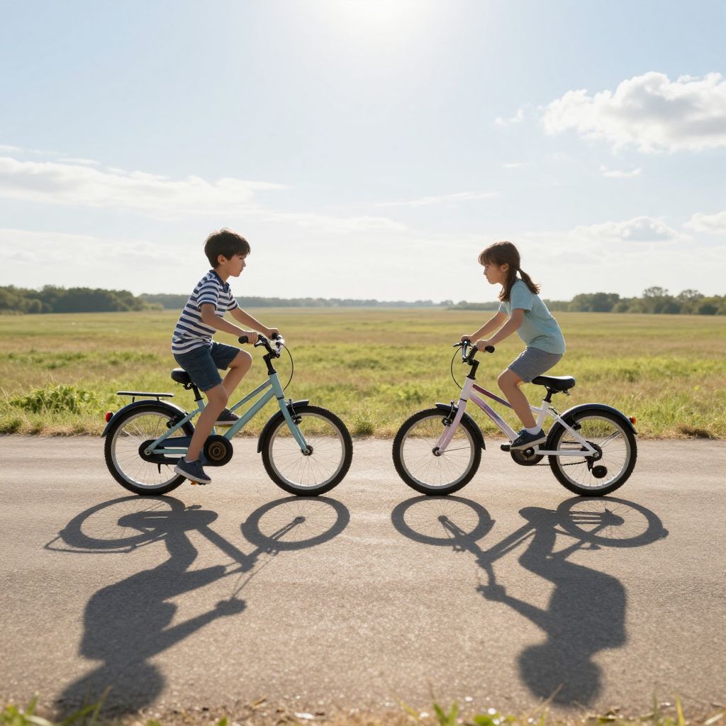 Two children pedal bicycles whose wheels cast shadows that mirror their forms, defying the laws of light and perspective in a surreal dance across a dreamlike landscape.