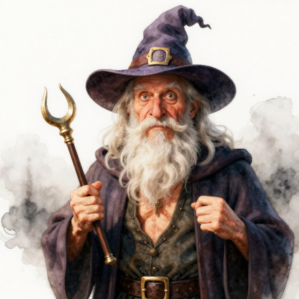 Digital painting of a startled, elderly wizard with white beard, purple hat, and dark cloak, holding a golden trident, against a misty white