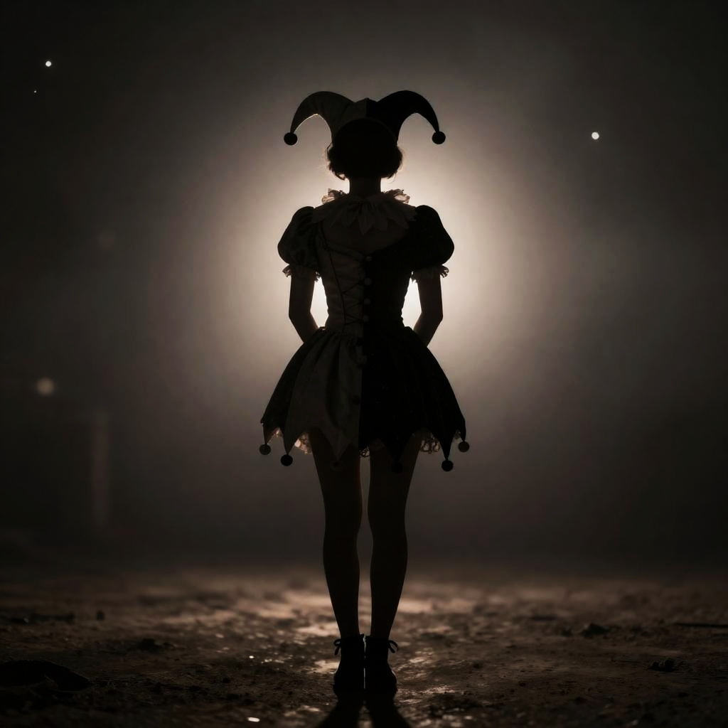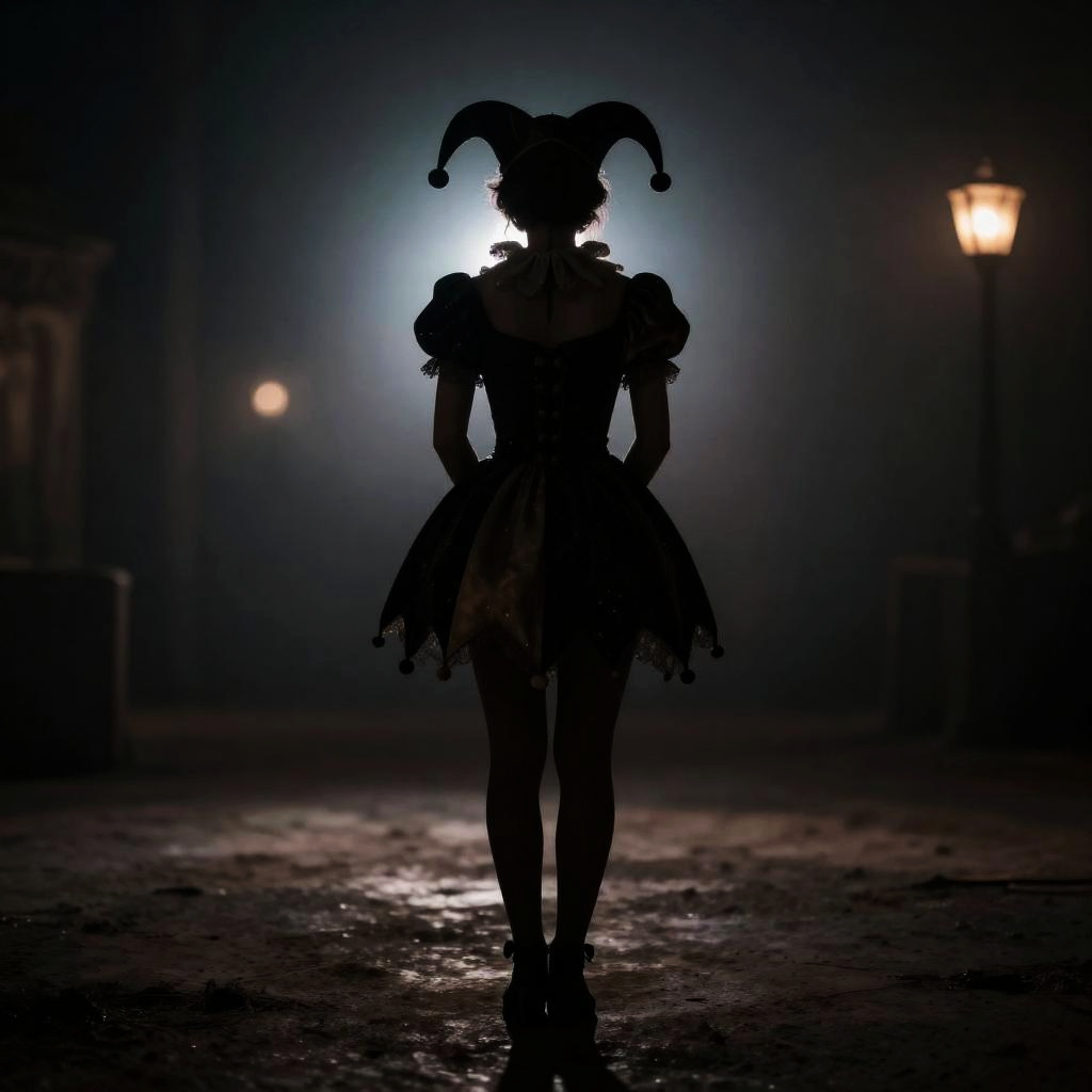 A place with a morbid look that resembles a funeral, sepulchral mi BREAK 1.2, silhouetted in soft shadow (full body photograph:1.2) Starlight Circus jester costume:1.3 retired carnival queen:1.1 hands behind her back detailed background bokeh, female jester costume, Starlight Circus theme, full body soft shadow silhouette, retired carnival queen elegance, hands behind back, detailed background bokeh, subtle starlight glow, moody lighting
