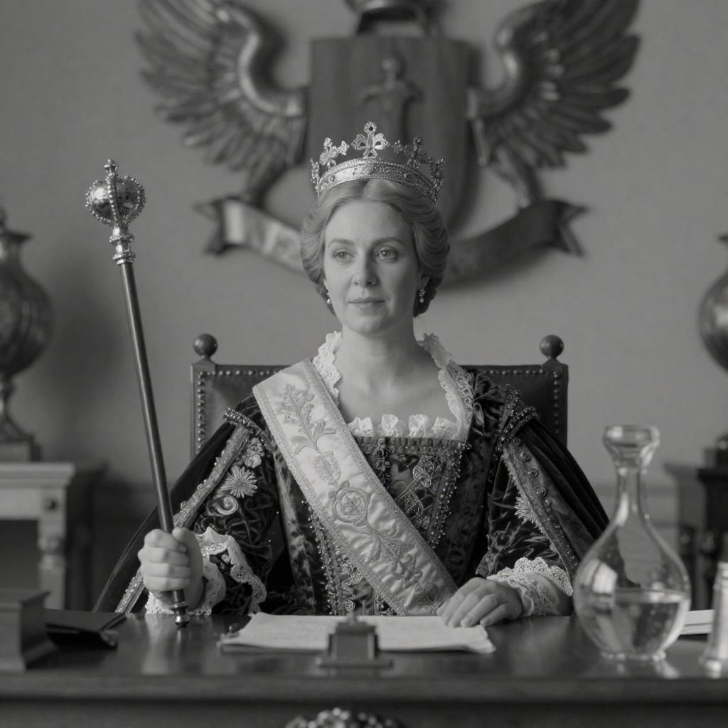 Black-and-white photograph of a regal woman with light-colored hair, wearing a crowned headpiece, elaborate lace and velvet dress, and a large embroidered sash. She sits behind a wooden desk with a large ceremonial staff and a glass decanter. Background features an ornate coat of arms with wings. She gazes slightly to the side with a calm expression.