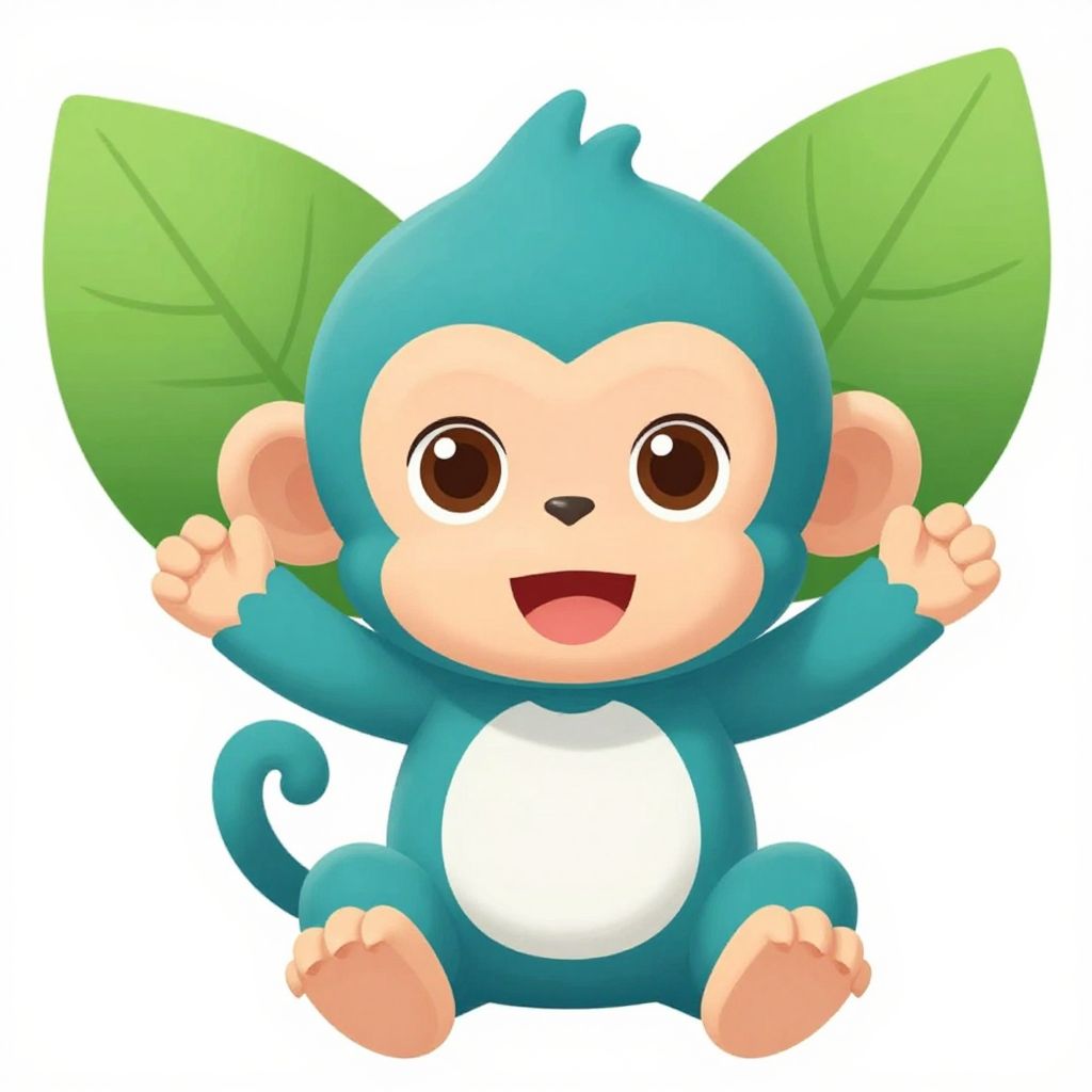 Illustration of a cute cartoon monkey character with large brown eyes, blue-green fur, and a white belly, sitting happily with its arms raised. Two large green leaves are positioned behind the monkey, resembling wings. The character has a small tuft of hair on its head, a curled tail, and sharp little claws.