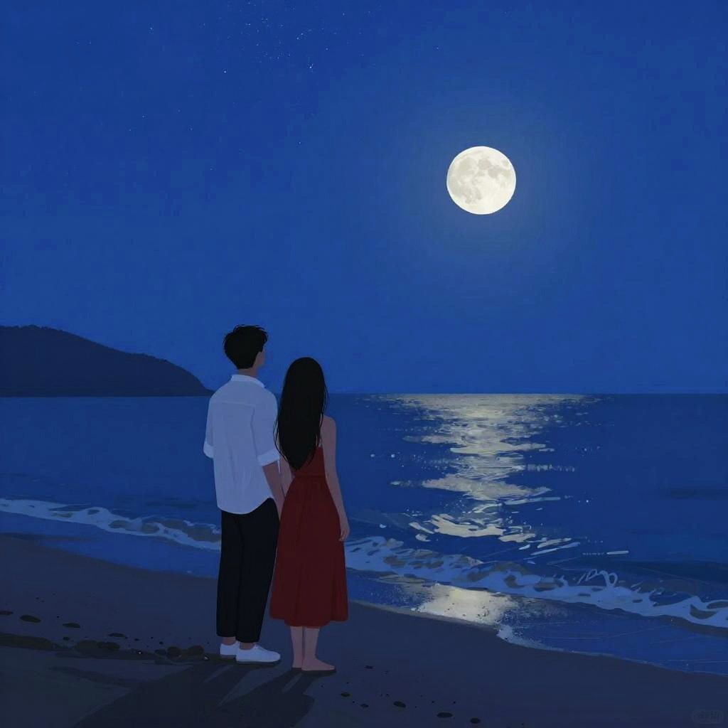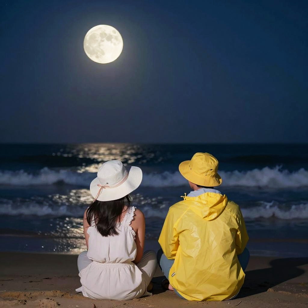 Photograph of two people sitting on a sandy beach at night, facing a bright full moon in a starry sky. One person, in a white sunhat and light-colored clothes, sits to the left. The other, in a yellow raincoat and matching hat, sits to the right. Waves gently crash in the background, creating a serene and magical atmosphere.