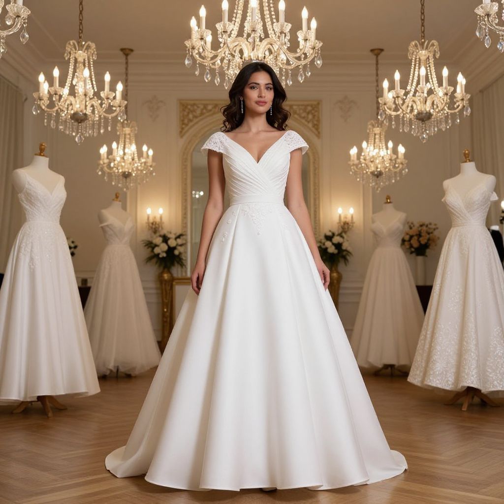Photograph of a young woman with wavy dark hair wearing a white, V-neck, short-sleeved wedding gown with a fitted bodice and full skirt. She stands in an elegant room adorned with multiple crystal chandeliers, their warm light illuminating the space. In the background, three white wedding dresses are displayed on dress forms, each with different styles and textures. The room features white walls, ornate molding, and wooden parquet flooring. A gold-framed mirror and floral arrangements are visible in the background. The overall ambiance is luxurious and classic.