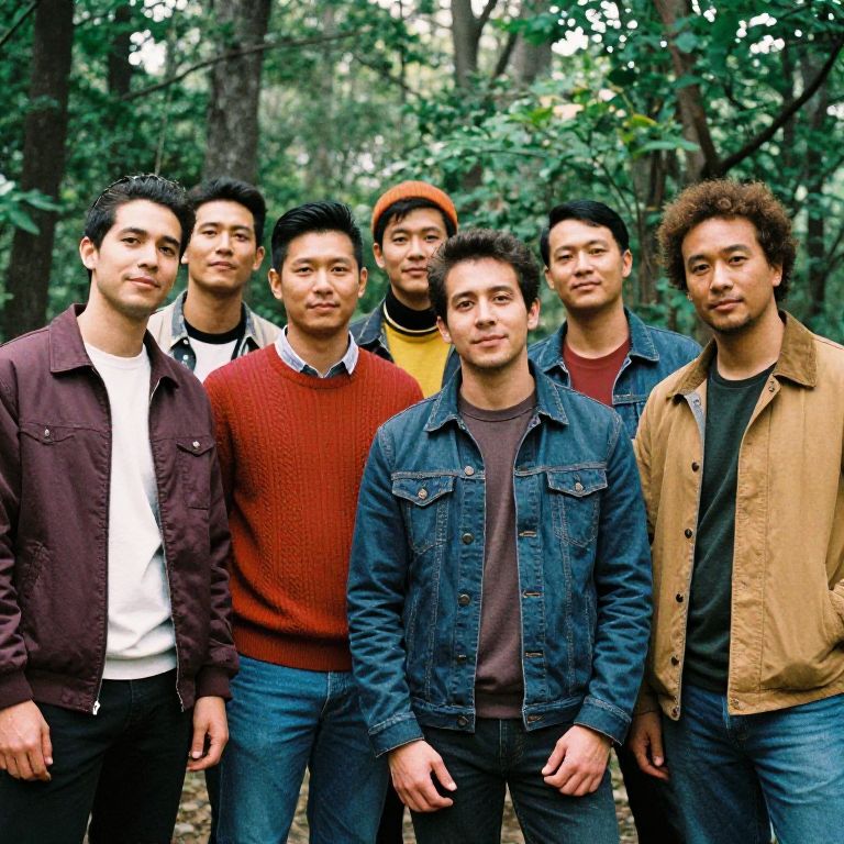 A vibrant group photo of male friends in a forest setting, captured with a Technicolor analog film aesthetic, showcasing their camaraderie and coordinated autumnal attire.