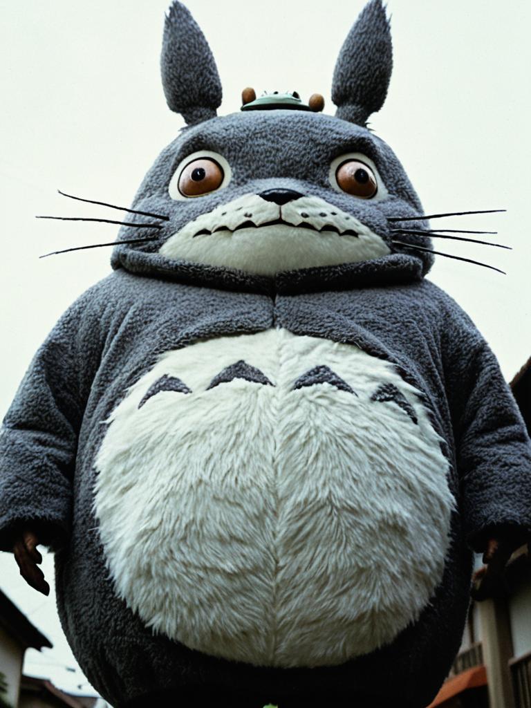 Man in Totoro costume, photorealistic dramatic low-angle shot, cinematic realism