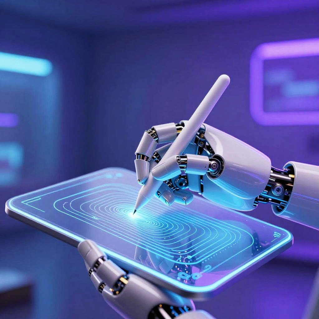 Ai draw tool concept showcasing a robotic hand holding a stylus, creating digital art on a glowing transparent tablet, sci-fi environment with vibrant blues and purples, smooth gradients and sharp lines, hyper-realistic rendering