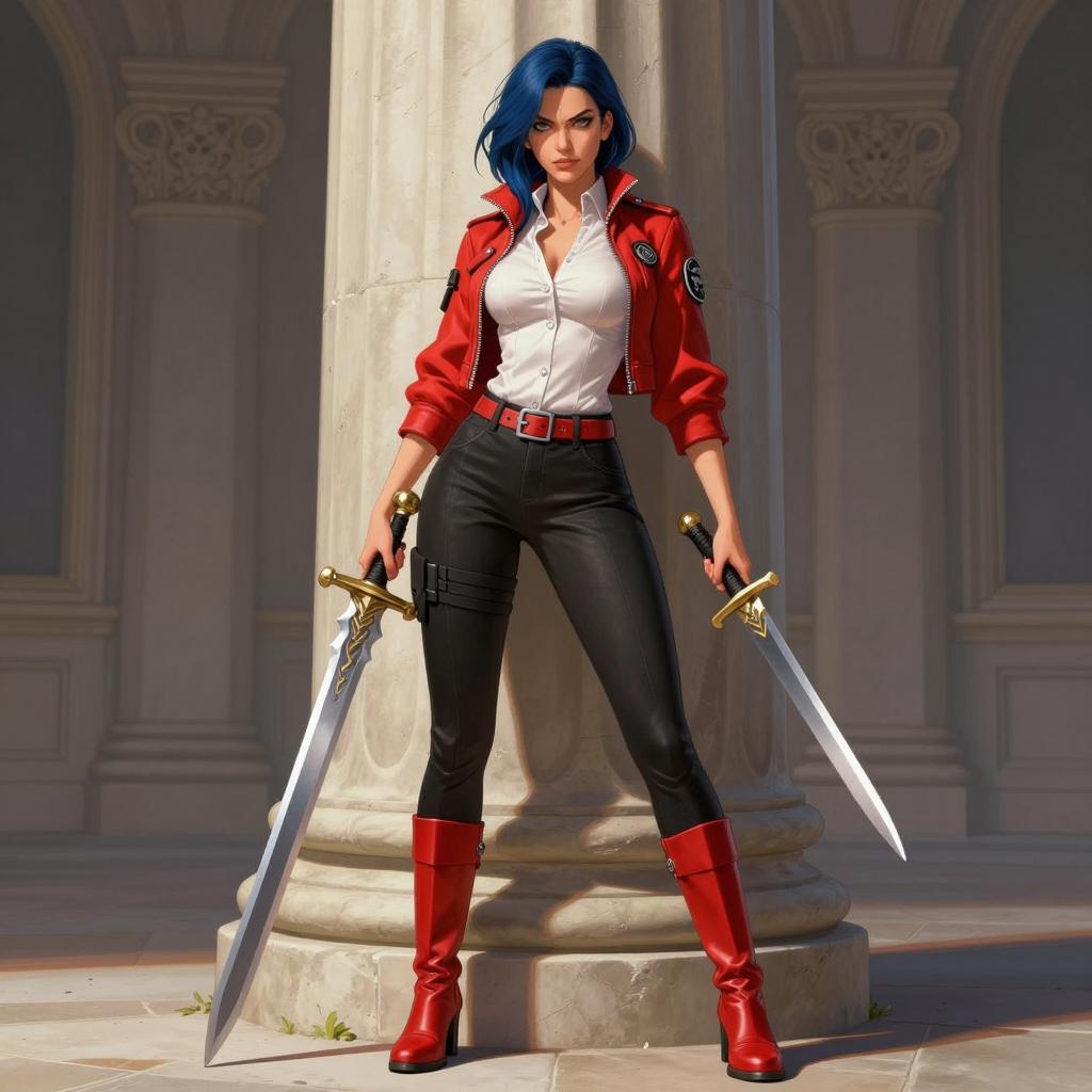 Digital illustration of a female warrior. She has long black hair, red eyes, and wears a red shirt with black pants and red boots. Her arms are skeletal with metal armor. She holds a large sword in her right hand and a smaller sword in her left. She stands in a ruined stone building with columns. She has large silver hoop earrings. Her expression is intense. The background is blurred.