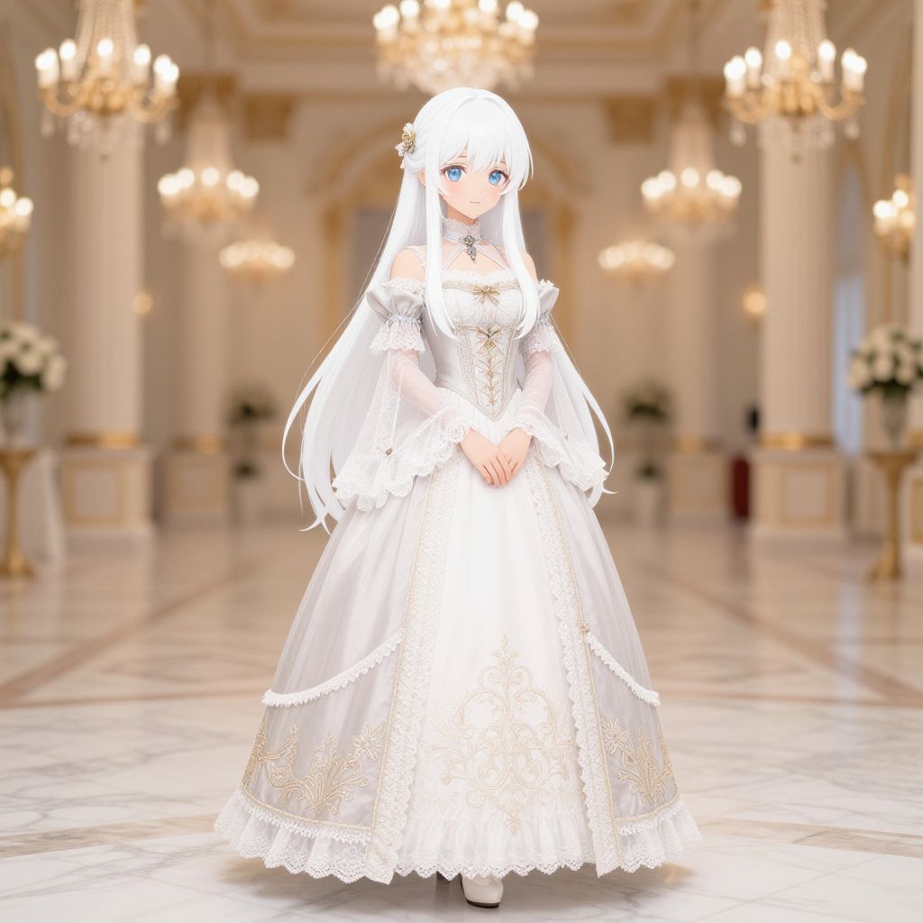 Digital artwork of an elegant anime-style woman with long light purple hair, wearing a detailed white lace dress with a golden belt featuring intricate decorations. She stands in front of an ornate large round mirror with a regal frame, set in a richly decorated interior with soft lighting.