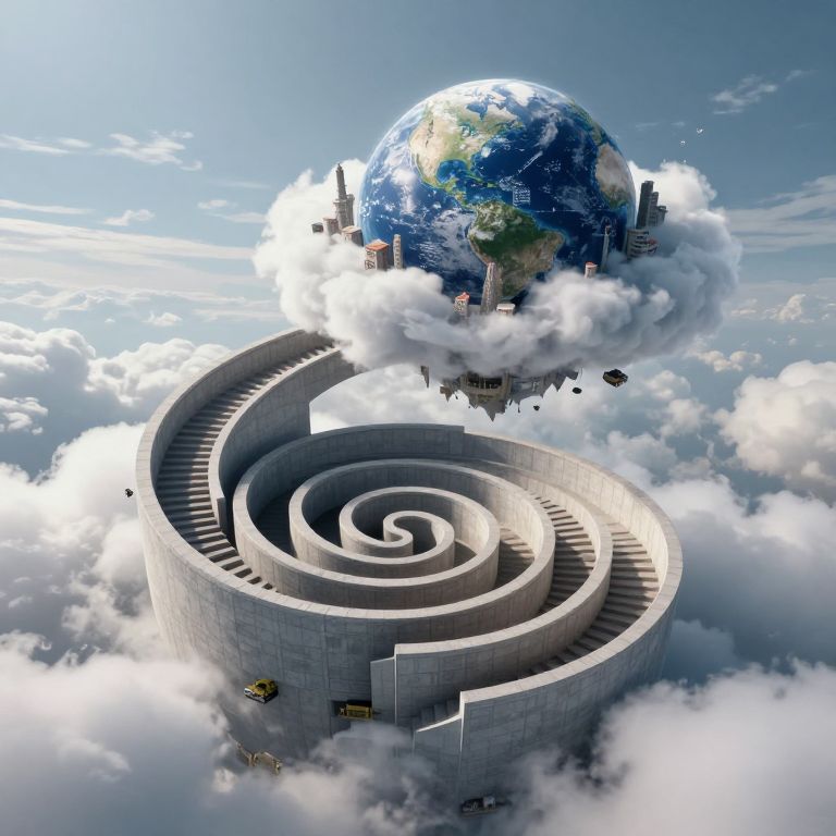Digital artwork of a swirling concrete maze ascending into the sky, ending in a floating city with skyscrapers and Earth, surrounded by clouds.