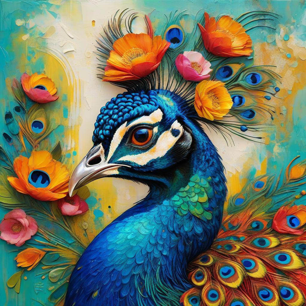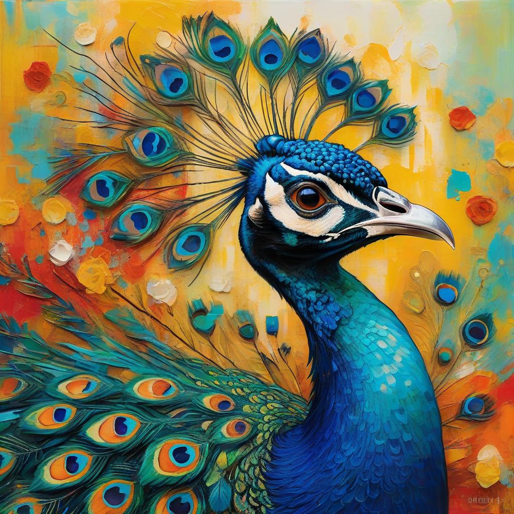 A vibrant, colorful artwork of a peacock with an elaborate, abstract hairdo and striking makeup. The piece features fine line work with radiant coloring on an encaustic-textured surface, combining techniques like decoupage and impasto. Inspired by Frida Kahlo and Gustav Klimt, the artwork fuses elements of art nouveau, folk art, and modernism to create a bold and energetic composition. The colors are vivid, with a layered, textured finish that evokes a sense of dynamic movement and modern artistic expression.