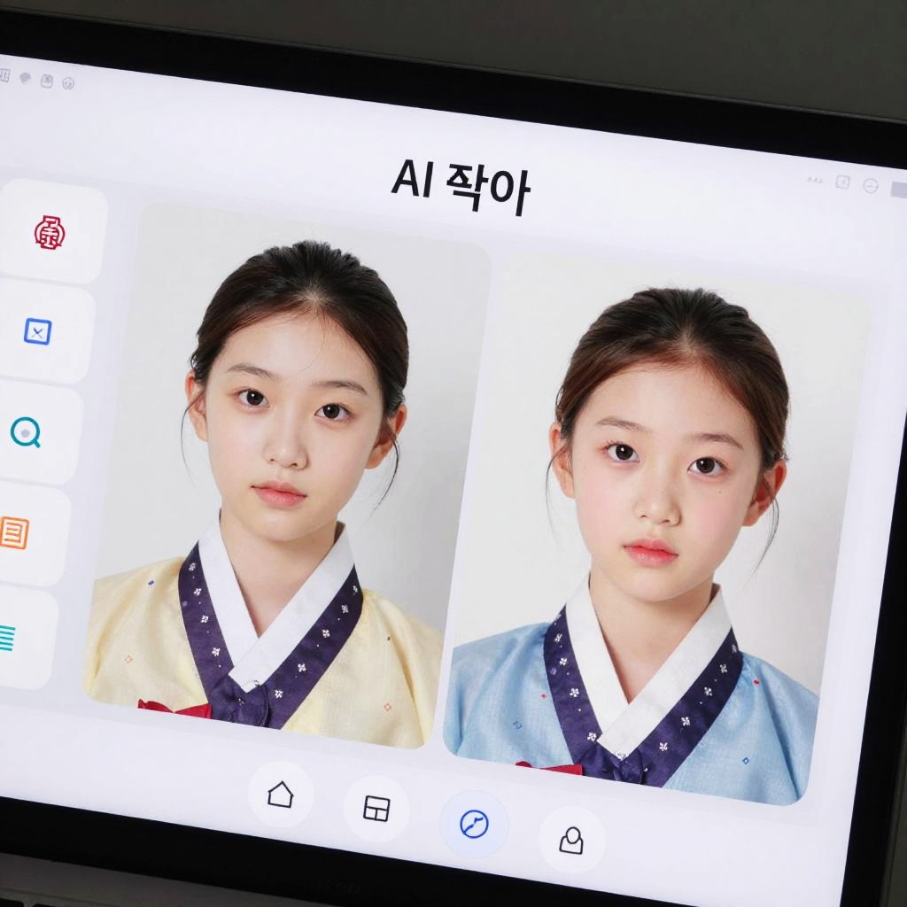 Close-up of a digital screen displaying a Korean AI filter interface, showing before and after images of a person's face transformation, soft pastel color palette with sleek cybernetic UI elements, blending traditional Korean motifs and modern technology in a seamless design.