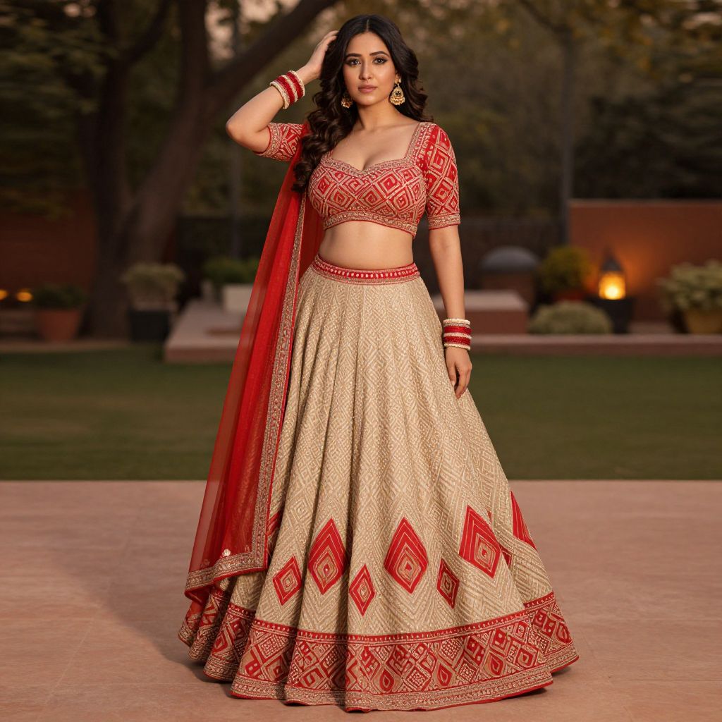 Photograph of an Indian woman with medium-dark skin and long, wavy black hair. She wears a red and beige traditional lehenga choli with intricate geometric patterns, a red cropped top with short sleeves, and a matching long, flowing skirt. She has a red dupatta draped over her right shoulder, red bangles on both wrists, and large, dangling earrings. She stands in a serene outdoor garden at dusk, with blurred trees and dimly lit lanterns in the background. Her right hand rests on her head, and she gazes confidently at the camera. The lighting highlights her elegant attire and serene expression.