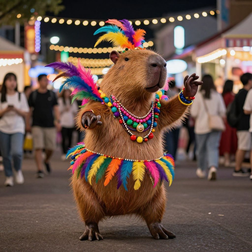 Capybara dressed up in a colorful carnival costume with feathers and beads, dancing joyfully amidst a vibrant street festival, rich in festive lights and motion blur.