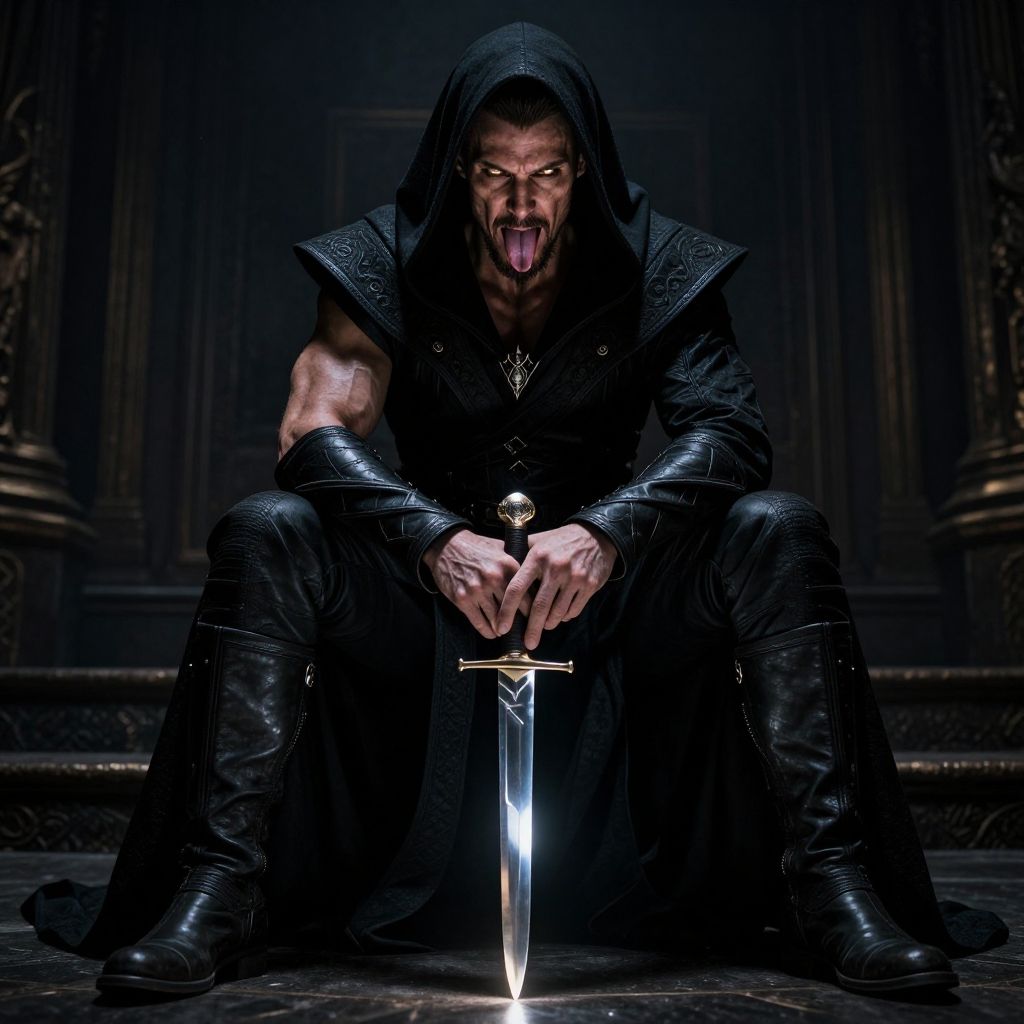 Photograph of a menacing figure in dark medieval armor, squatting with legs apart, holding a glowing sword between them. The figure has a muscular build, pale skin, and an intense, snarling expression with tongue out. He wears a black hooded cloak with textured shoulder guards and black leather pants. The background is a dimly lit, ornate, dark wooden room with columns. The sword's blade is illuminated, contrasting with the dark, shadowy surroundings. The overall mood is ominous and dramatic.