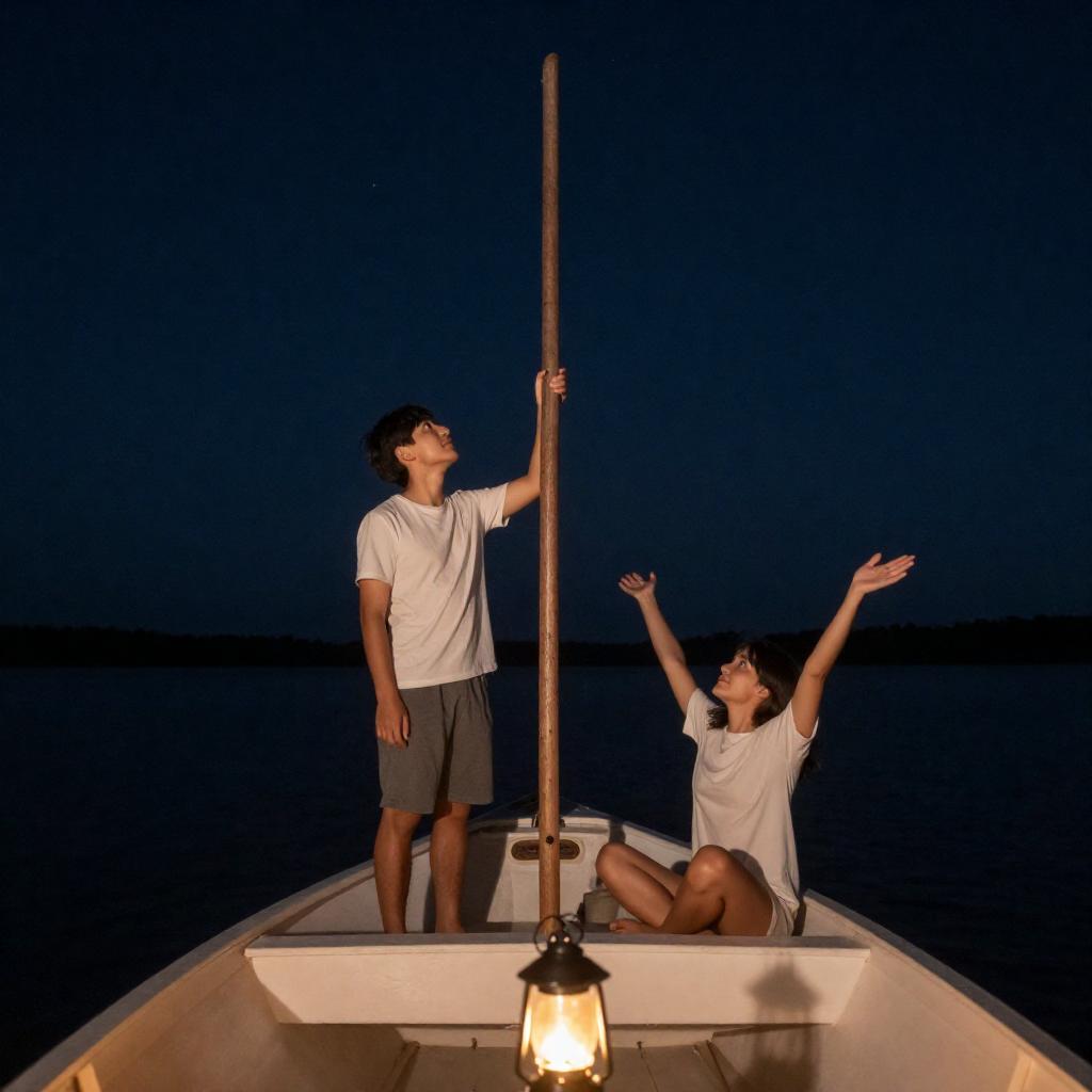 Photograph of two young adults in a small boat at night. One person stands holding a wooden mast while looking upwards, wearing a white t-shirt and dark shorts. The other person is sitting with arms raised, also wearing a white t-shirt and casual shorts. A lit lantern is positioned at the front of the boat. The background features calm water and a dark, starry night sky.