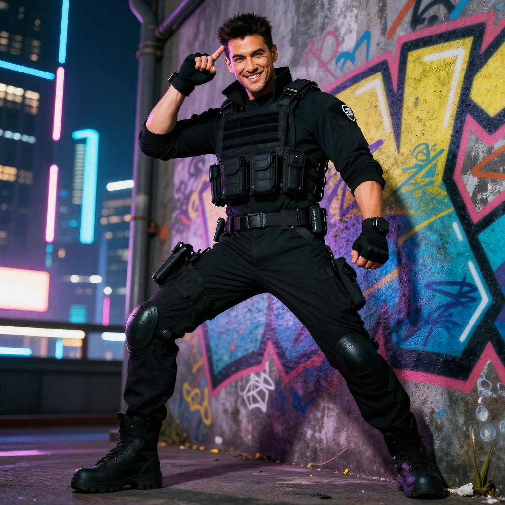 Powerful male poses set against a futuristic cyberpunk cityscape, a man in tactical gear leaning against a neon graffiti wall, confident smirk and dynamic posture, vibrant colors and high contrast highlighting his commanding aura.
