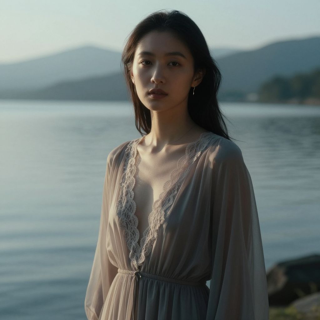 BlakeL_SoloTI_v1, PA7_Portrait-MCU, (modern photo, Flowing maxi dress in muted tones, delicate lace details, minimalistic jewelry:1.1), closeup portrait, 85mm, (analog, cinematic, film grain, hazy atmosphere:1.3), (( Tranquil lakeside backdrop, misty mountains, soft sunlight casting a melancholic ambiance:1.2)), detailed eyes, (seductive), (cinematic shot:1.3)