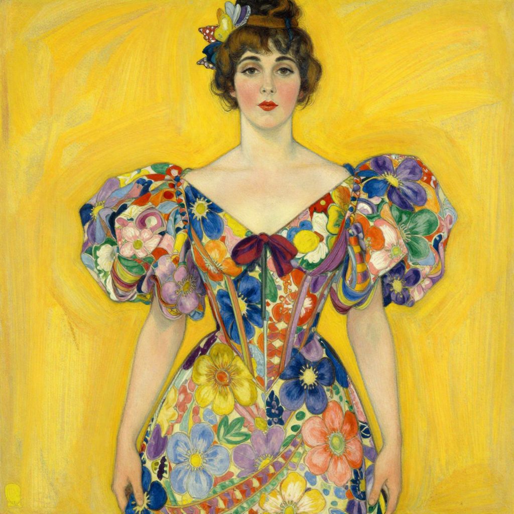 A vibrant illustration inspired by Natalia Goncharova's style, featuring a woman in a colorful floral dress with puffed sleeves and a structured bodice, set against a bold yellow background, evoking the retro charm of early 20th-century costume design.