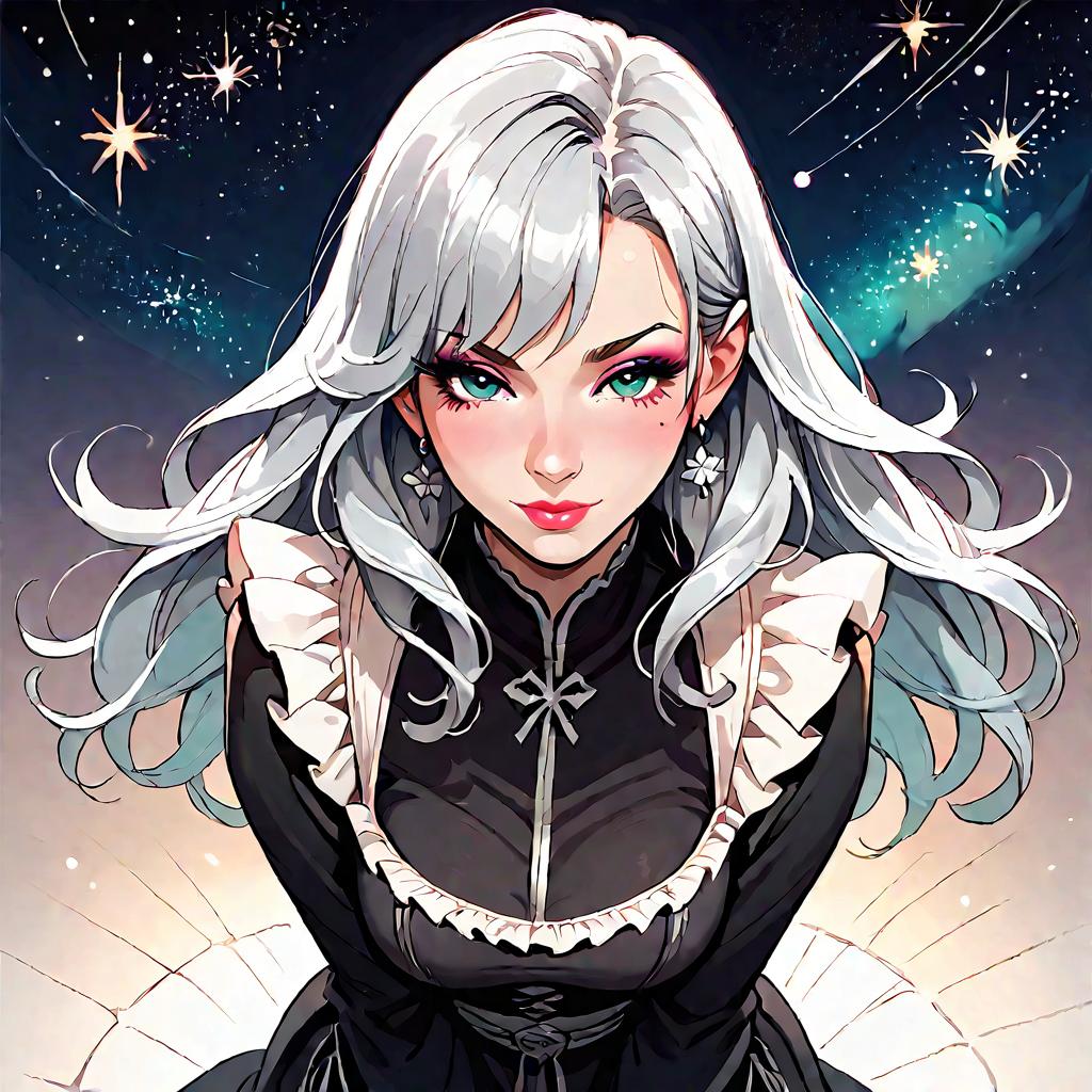 Score_9, score_8_up, source_anime, 1girl, mature female, anime coloring, long hair, silver hair, green eyes, medium breasts, black dress, frills, seductive smile, polka dot, night sky, starry sky, from above