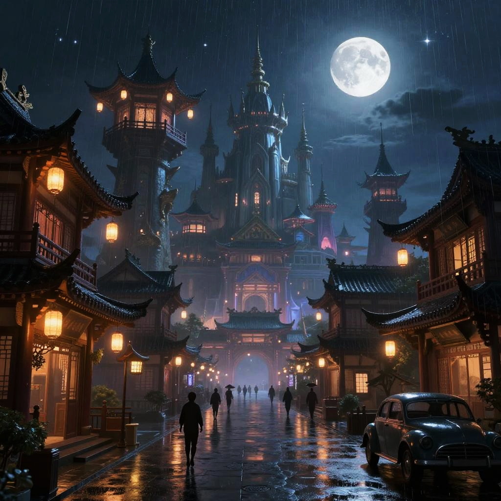 This digital artwork depicts a dark, moody night scene in an Asian-style city with Gothic spires in the background. The sky glows with a full moon, casting a blue hue over the wet, reflective streets. Silhouetted buildings line both sides, with warm yellow lights from windows and street lamps. A few people in dark coats walk on the right, while a car is parked on the left. Stars twinkle above.