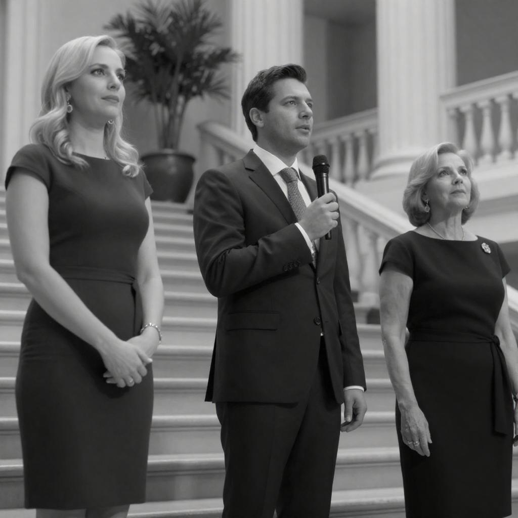 Black-and-white photograph of three people on a grand staircase. Blonde woman in dark dress leans on railing. Dark-haired man in suit and tie stands in middle, holding microphone. Older woman in dark dress stands on right, looking up. Background includes columns and potted plant. Man's expression is focused, women's expressions are neutral.