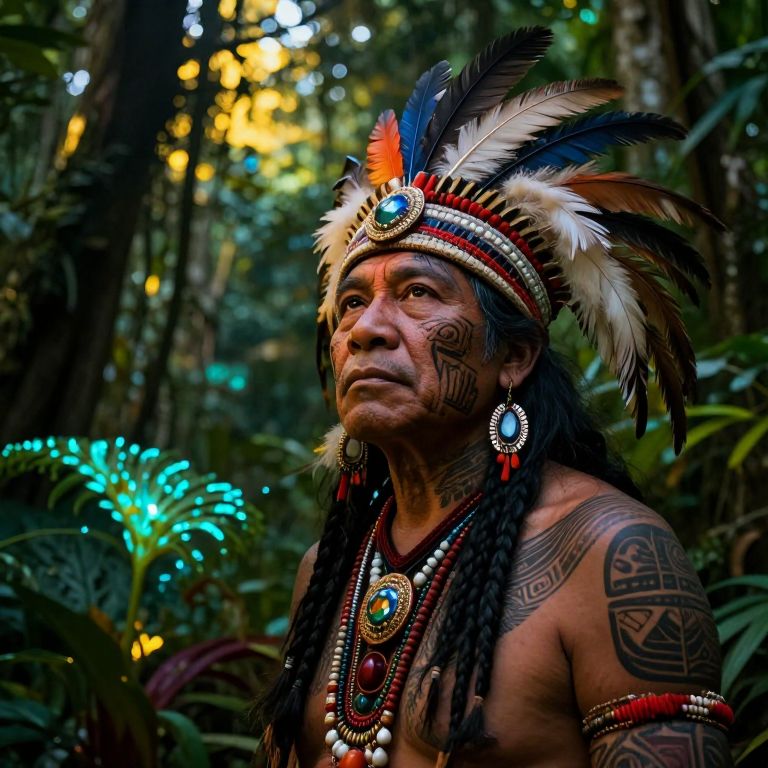 Craft a hyper-realistic portrait showcasing an indigenous shaman's serene yet commanding presence amidst the lush bioluminescent flora of the Amazonian rainforest. Focus on their seasoned visage adorned with intricate tribal tattoos and crowned by an elaborate headdress crafted from vibrant feathers and precious stones, radiating wisdom and strength in the soft golden light filtering through the canopy. Capture this scene from a low-angle perspective, drawing attention to the shaman's captivating eyes that reflect the enchanting glow of the surrounding plants, evoking a profound connection with nature and a mystical aura that transcends reality.