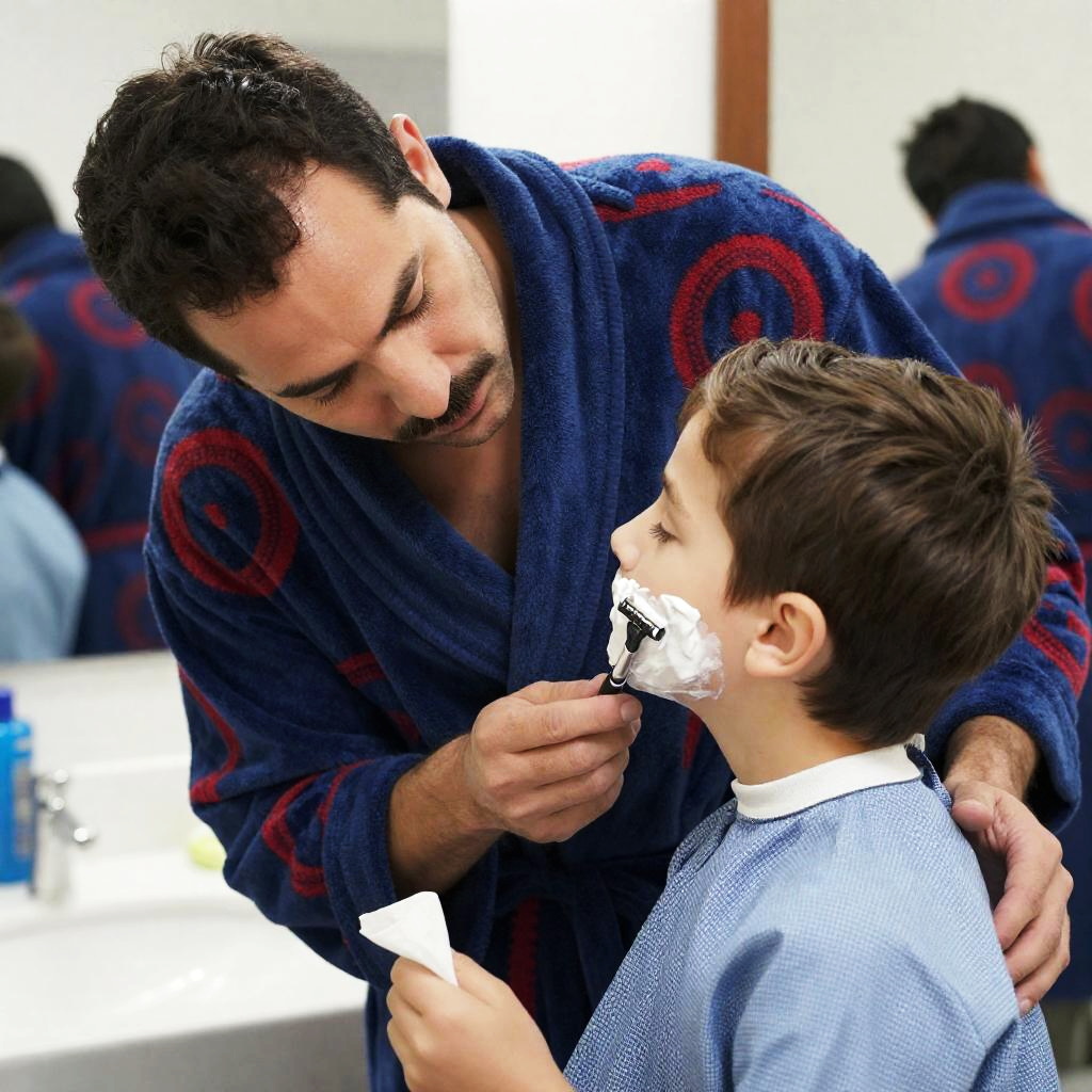 Photograph of a man with dark hair and a mustache, wearing a blue and red patterned bathrobe, shaving a young boy with brown hair in a blue checkered shirt. Background includes other people and bathroom items. Man leans forward, focused, holding a razor to the boy's cheek. Boy holds a tissue in his left hand. Bright indoor lighting.