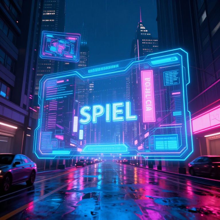 Spiel, a futuristic digital interface displaying a virtual spiel in a cyberpunk cityscape, neon lights reflecting on rain-soaked streets, high-tech holograms floating, sleek modern design, vivid contrasting colors and dynamic composition