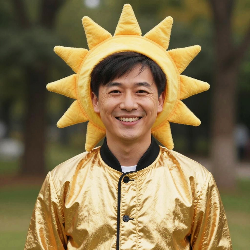A man dressed in a shiny golden jacket with black trimming smiles warmly at the camera while wearing a whimsical, sun-shaped hat. The photorealistic outdoor portrait captures a joyful and playful atmosphere with soft natural lighting and a blurred forest background.