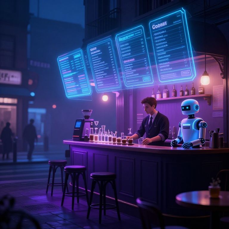Neon-lit cyber café with a human bartender and a robotic barista, illuminated menu screens, and purple ambient lighting. Digital art style.