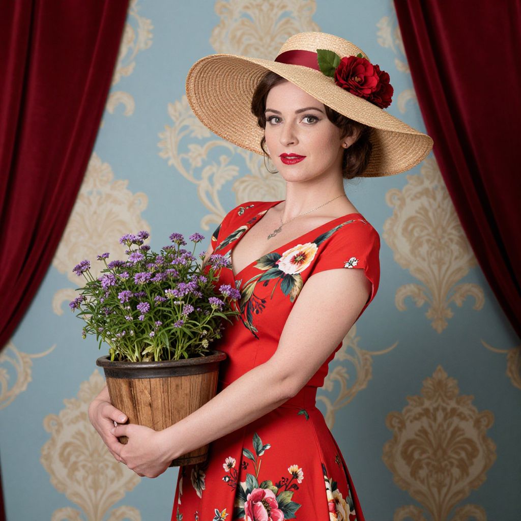 Woman wearing a vibrant red 1940s-style dress adorned with floral patterns, complemented by a wide-brimmed straw hat decorated with red flowers and green leaves, stands gracefully while holding a wooden pot filled with small purple flowers, set against a backdrop of ornate blue wallpaper and red curtains.