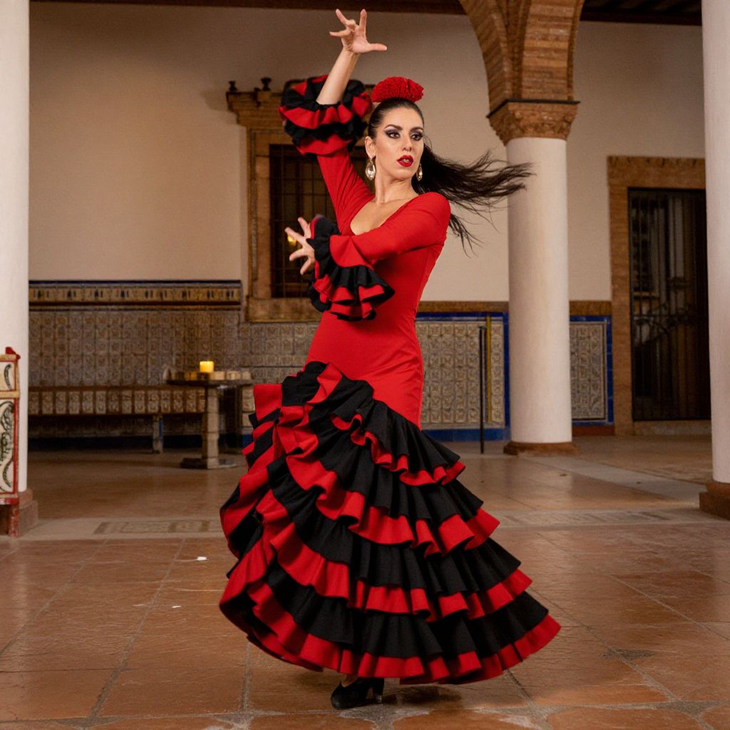 Photograph of a dramatic, dark-haired woman in a vibrant red and black ruffled flamenco dress, mid-dance, in a tiled courtyard with