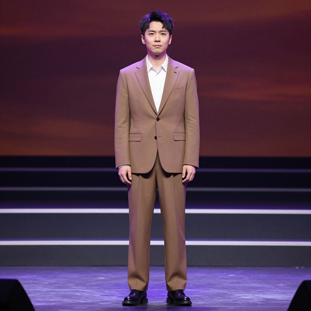 Earth Tone Outfit Costume, man in brown suit standing in front of a stage