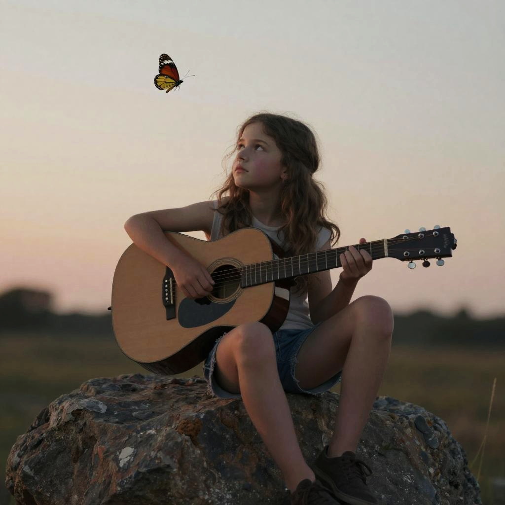 Photograph of a young girl with long brown hair, wearing a white t-shirt and denim shorts, sitting on a large rock at sunset. She holds an acoustic guitar and gazes at a butterfly hovering in front of her. The background is a soft, pastel-colored sky with a blurred field. The girl's expression is calm and focused. The rock is textured and rugged, contrasting with her smooth skin and the delicate butterfly. She wears black shoes, and her posture is relaxed yet attentive. The overall mood is serene and reflective.