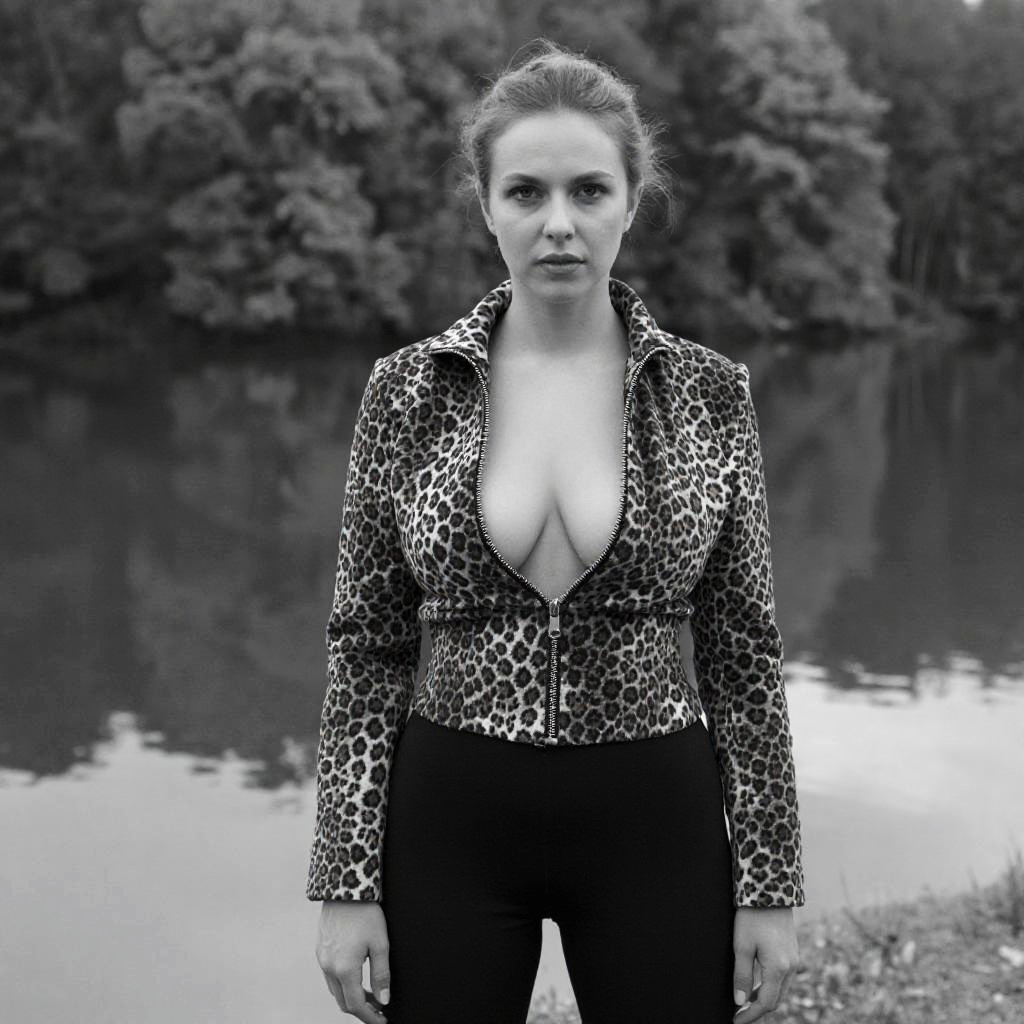 A black-and-white photograph of a serious-looking woman standing in front of a calm lake with a forested background. She has light skin, dark hair pulled back, and wears a leopard-print blouse with a deep V-neck, exposing significant cleavage. Her black pants contrast with the patterned blouse. The image has a high-contrast, dramatic style, with the woman centered, gazing directly at the camera. The lake and forest are slightly blurred, focusing attention on the woman. The overall mood is intense and somewhat provocative.