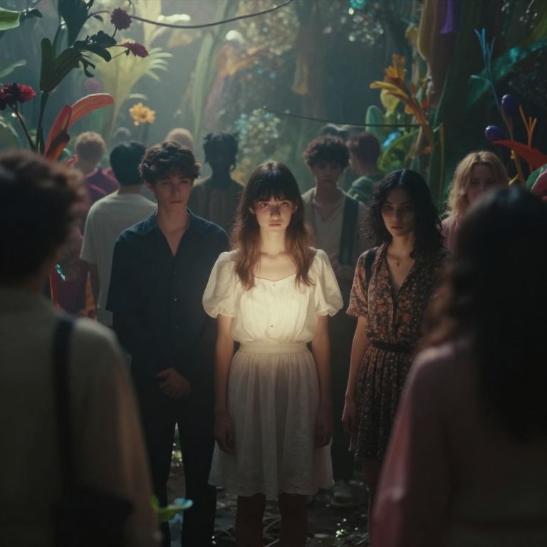 An enigmatic composition bathed in soft, diffused light, blending whispers of surrealism and melancholia, The scene unfolds in a cinematic atmosphere where subtle textures and delicate grains add depth, while the interplay of light and shadow enhances the quiet intensity of the moment, A subdued color palette merges with ethereal haze, evoking a dreamlike quality and timeless stillness, The central subject –A collection of youthful, vibrant figures in a crowded space glow under sharp clarity, The absence of masks reveals radiant and unchanging features, surrounded by sharp light and motion, The absence of darkness transforms the group into distinct individuals, their differences enhanced rather than erased, With a colorful, shifting environment, the scene conveys energy and motion that denies any sense of permanence, – is delicately framed, their presence balanced between mystery and intimacy, Surrounding elements, rich in symbolic undertones, anchor the narrative in an otherworldly context, Organic details like softly swaying flora or faintly glowing surfaces contrast with stark, haunting figures, creating a juxtaposition that is both poignant and surreal, The composition invites introspection, with negative space amplifying the mood's resonance, from the atmospheric depth to the muted highlights, serves to craft an image that feels suspended in an emotional, poetic realm, steeped in quiet nostalgia, surreal style