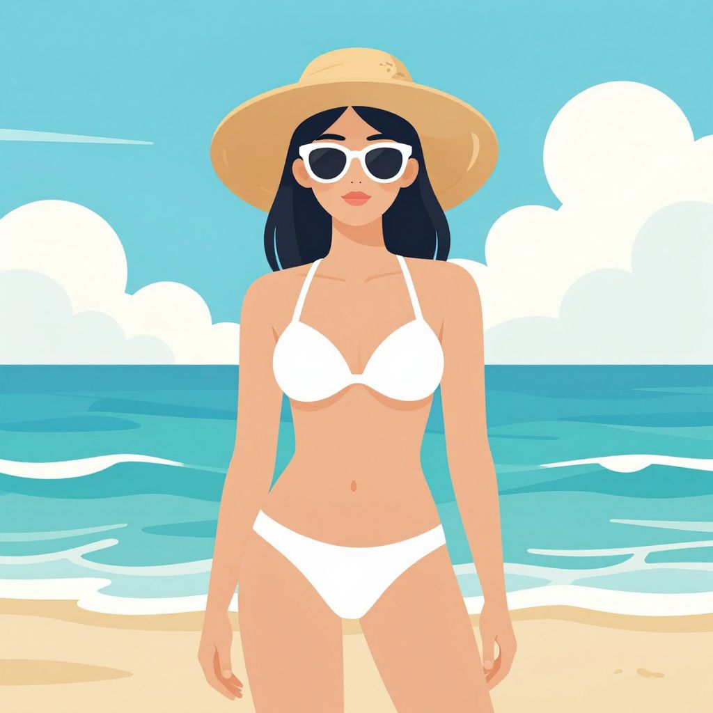 Summer beach girl vector illustration featuring a woman wearing a wide-brimmed straw hat, white sunglasses, and a white bikini, standing confidently against a serene backdrop of turquoise ocean waves and fluffy white clouds under a clear sky.