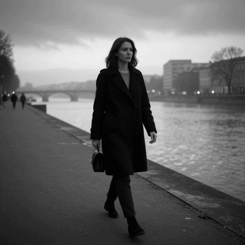 Monochrome street outfits, European woman, walking along a foggy riverbank at dusk, realistic photography, cold tones, dramatic sky, urban environment, detailed textures, cinematic composition